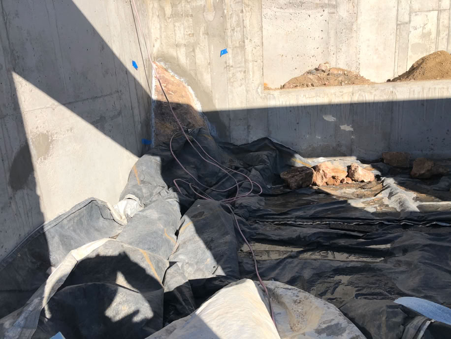 The Grotto with the protective plastic removed from the piece of bedrock (which still needs a name!) The floor was poured during cold weather, so the blankets were needed to keep it from freezing.