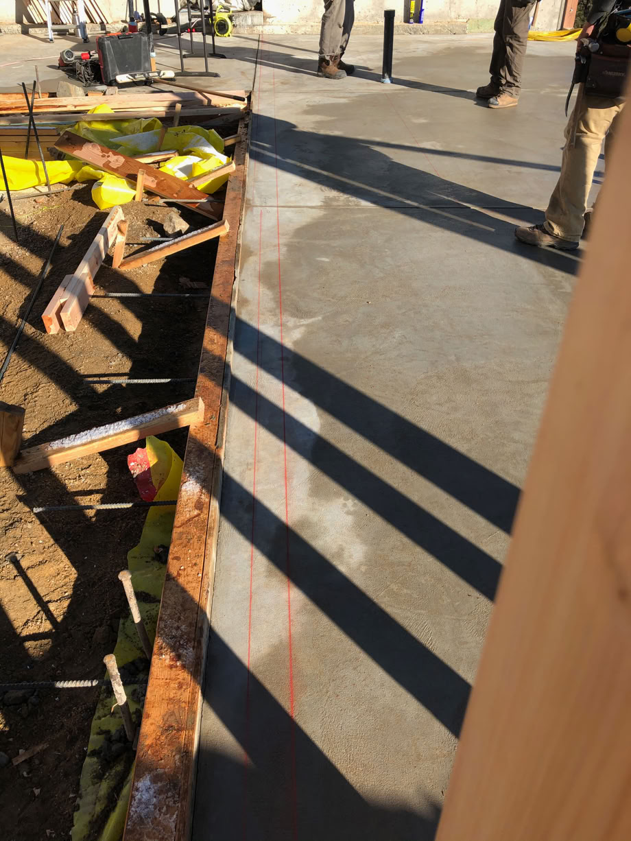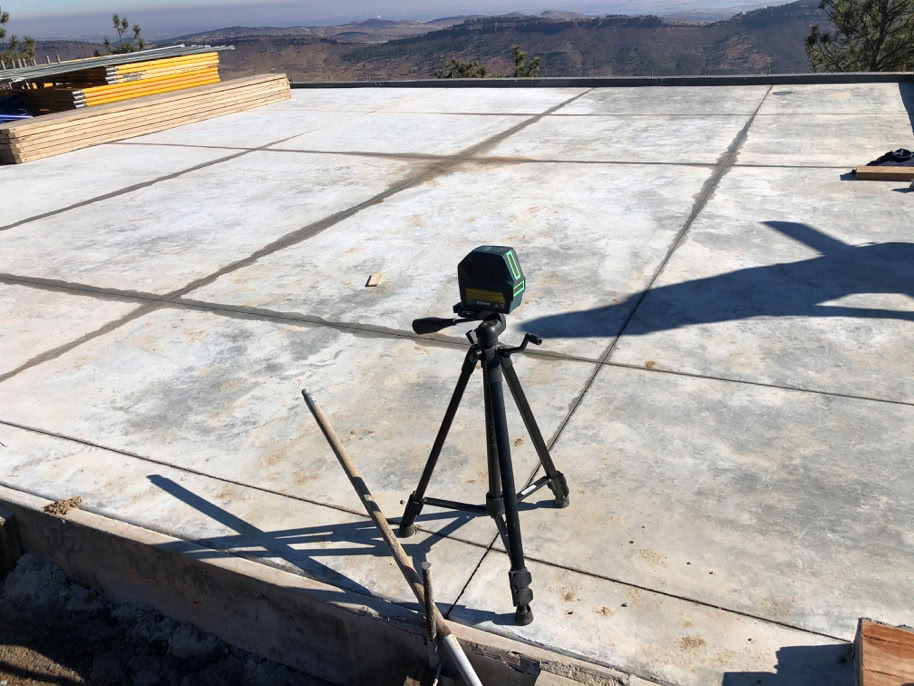 Here’s the laser level they used when shimming the sill plates to be absolutely level. You can also see the control joint cuts in the garage slab clearly here.