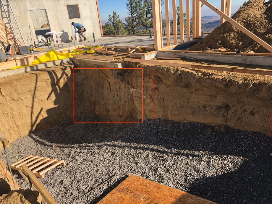 There’s the clean, washed gravel in the pool bottom. Things don’t always go right - the red rectangle marks where the fill collapsed back to bedrock, leaving part of the footer that holds the stairs unsupported. Once again, the structural engineer had to be consulted about the fix, which will be to form up and let the pool people shoot extra gunite under it to let it bear on the bedrock under the pool.