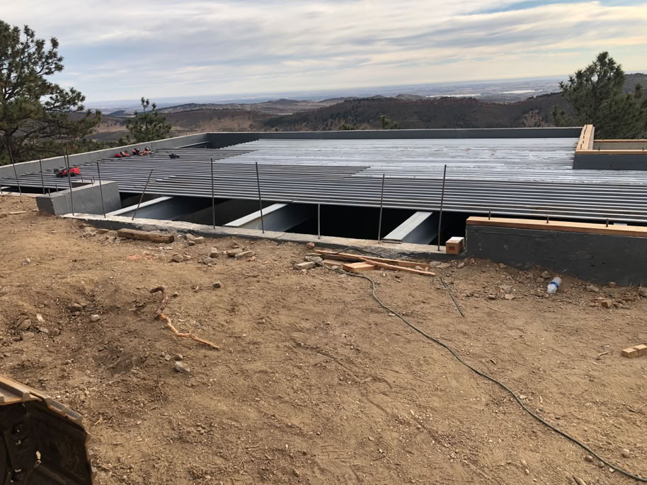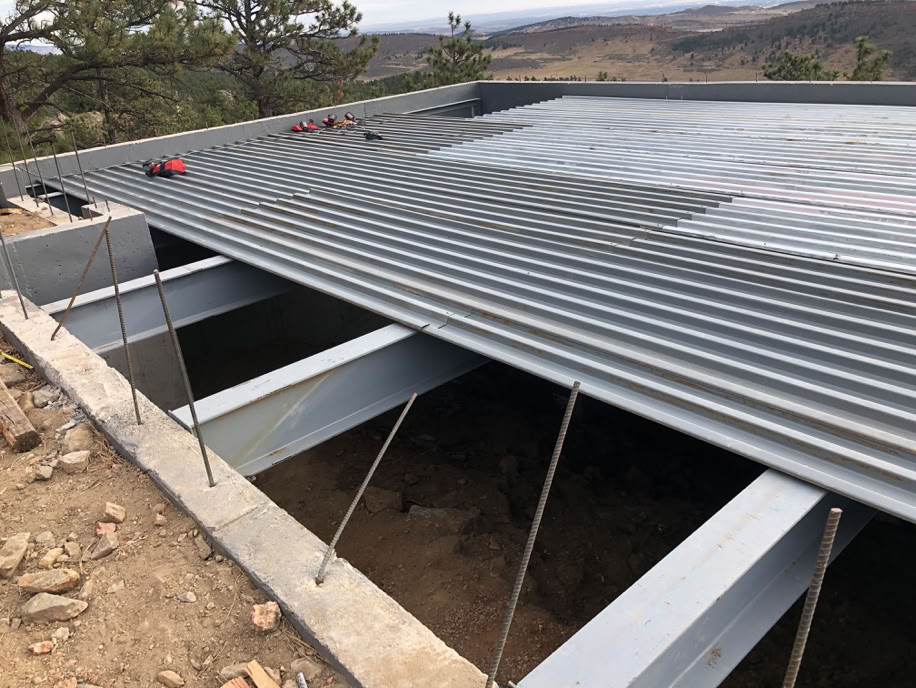 Two views of the steel decking. The last pieces can’t be placed until all the underfloor drains are placed.