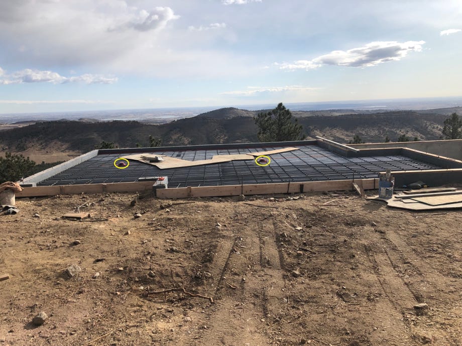 This is where one of the garage doors will be. You can see the rebar from the reinforced concrete wall has been bent down and tied to the garage slabs rebar mesh. That board’s top has been placed exactly at the top of the slab. The red tape is sealing the steel deck to the perimeter wall.