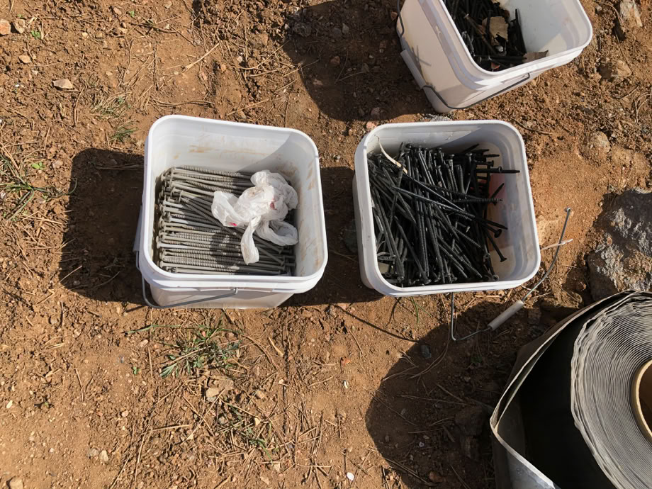 These long screws are what hold the styrofoam down. At the bottom right is the “tape” used to cover seams in the membrane.