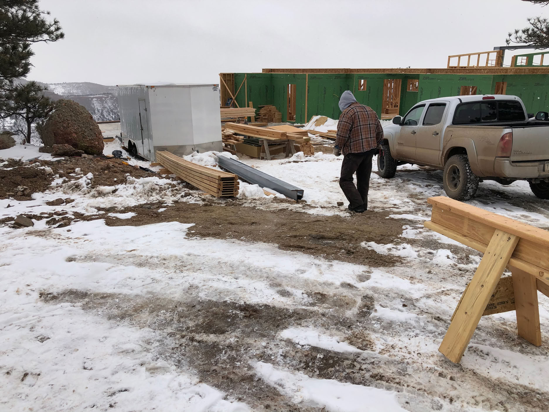 Yes, the intrepid framing crew is working in the snow today! Looking due east from the east master bedroom The snow falling in front of the trees looked really neat, but the only way to capture these things is with a video!