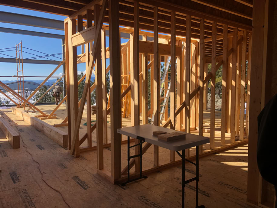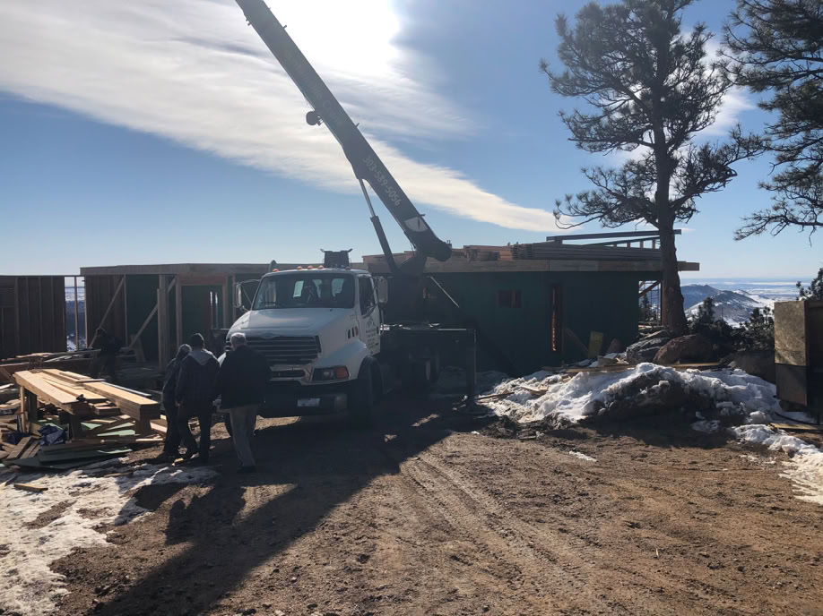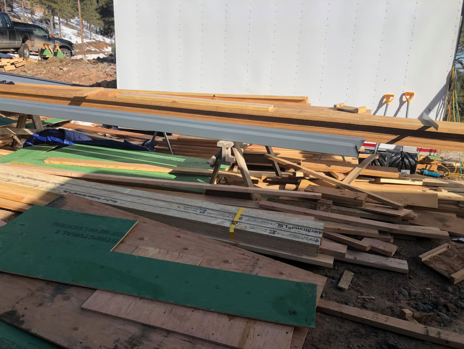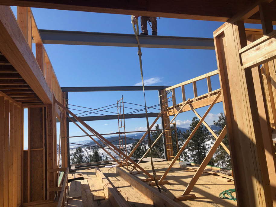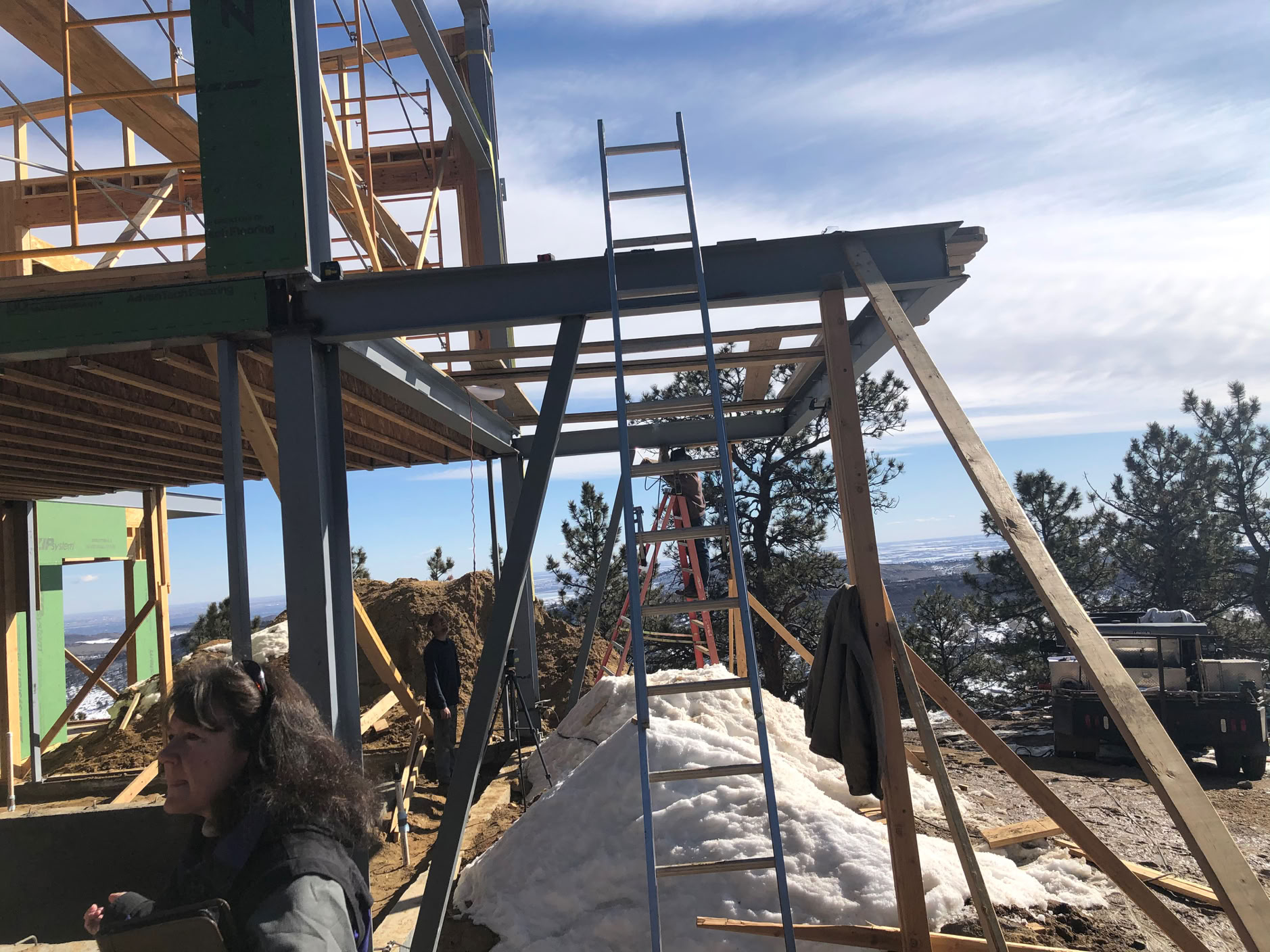 Here’s some of the roof structural members and the two pieces of steel box are the upper level kickers. It looks a bit chaotic, but when the weather is good in Colorado in the winter time, you build!
