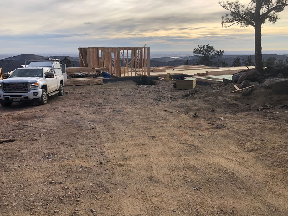 The fire cistern and the propane tanks have been placed. The very first of the upper level framing - the Office, Mud Room, Mechanical Space, Powder Room and part of the Entry are up.