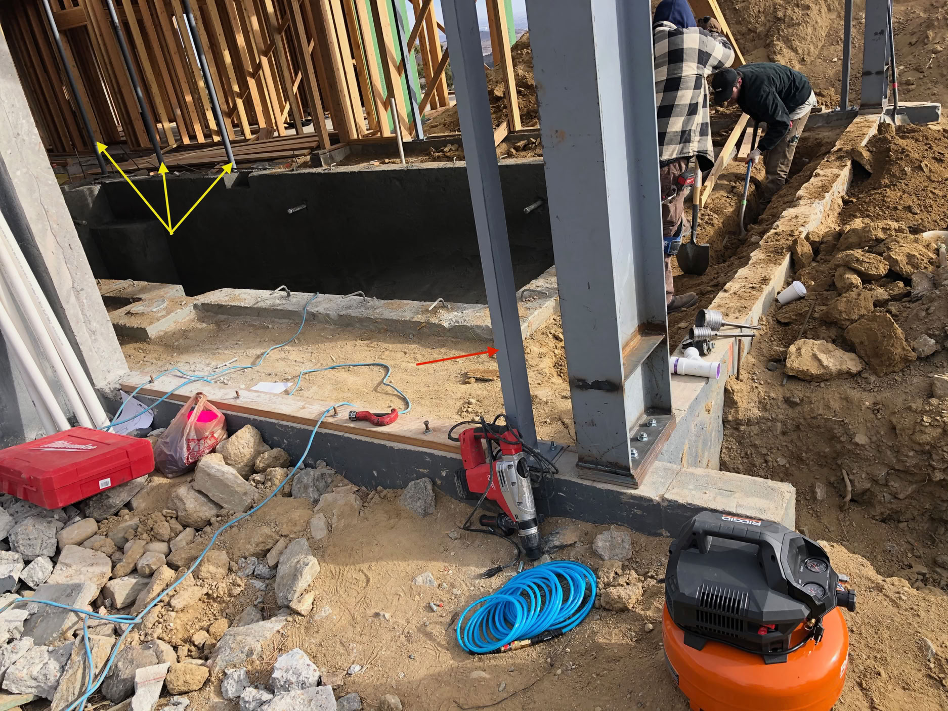 The lower level east and west window steel is starting to be placed. The thin box girder (pointed to by red arrow) just to the left of the big 16W X 50 will be one side of the west window. The yellow arrows point to the steel posts that have replaced the temporary wooden framing. The excavation to the right of the foundation wall is for the pool’s perimeter drain to daylight. The drill bits on the wall will be used to drill thru the wall for this drain.