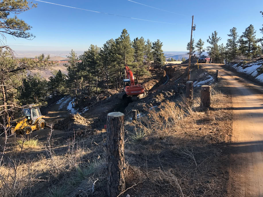 This day will take two pages! There’s a bit of catch up. Then, the utility trench water line, power conduits, propane line and telephone and data conduit are in and the trench is being backfilled. Then, the fire cistern and the driveway blasts occurred.