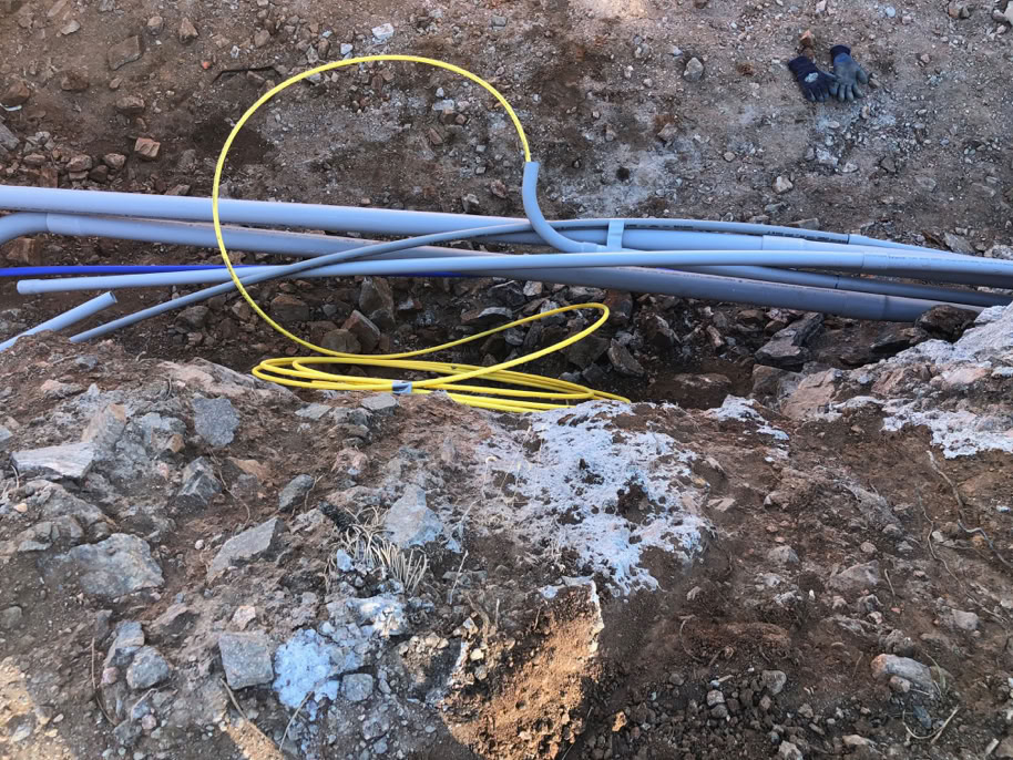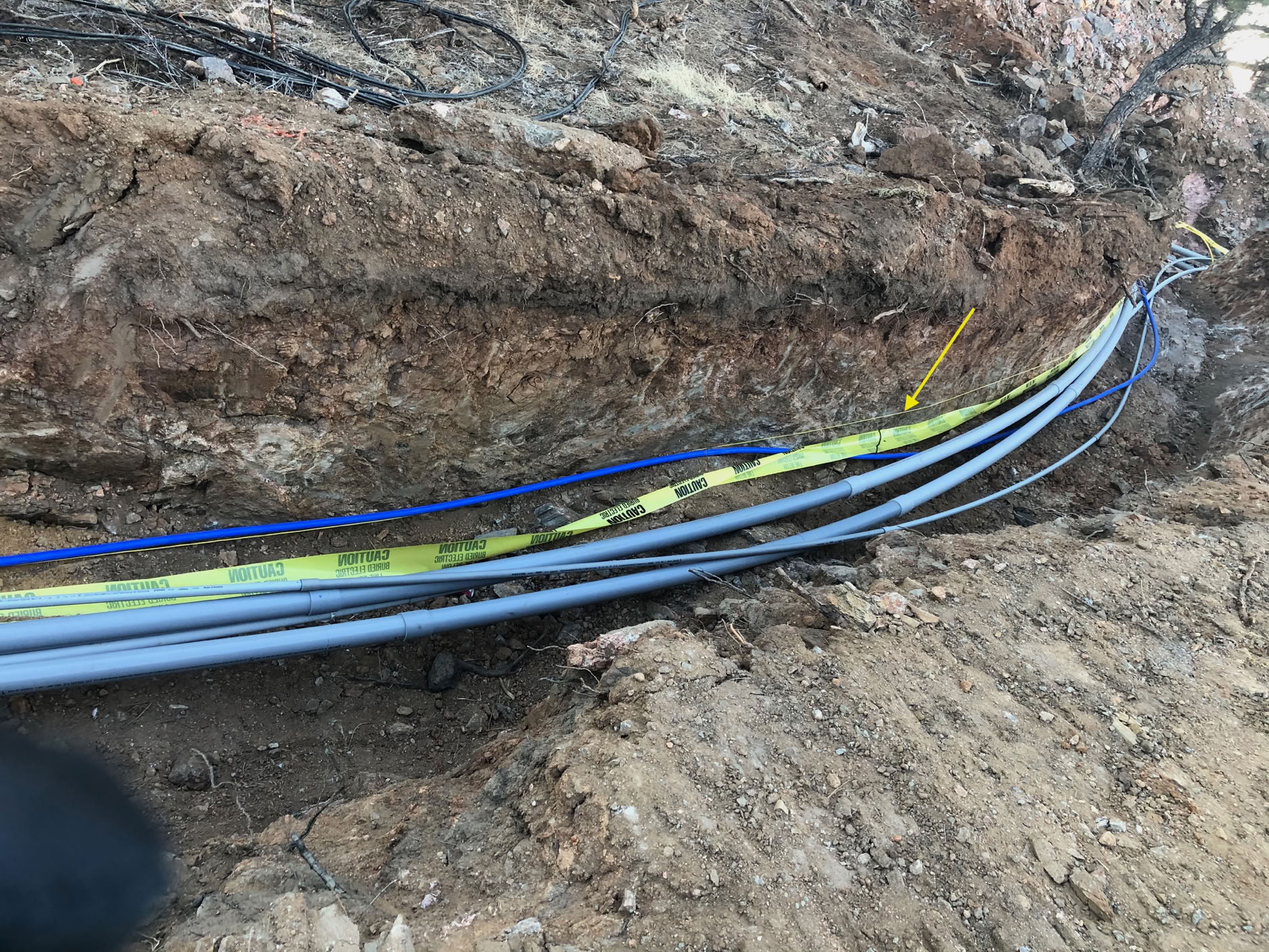 The final two things are now in place. The yellow arrow points to the tracer wire. A signal generator will energize this so that a detector can be used to exactly locate all of these conduits and lines. The yellow tape will be pulled up above the safe fill, warning a future excavator that he’s getting close to these conduits and lines.