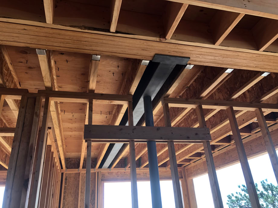 A bit of an interesting note. The architect was really unhappy with the upper floor columns. They just weren’t working with the light cable railing around the stairwell. So, it was decided to replace them with a steel beam that would be cantilevered off a steel post inside the east wall of the great room.