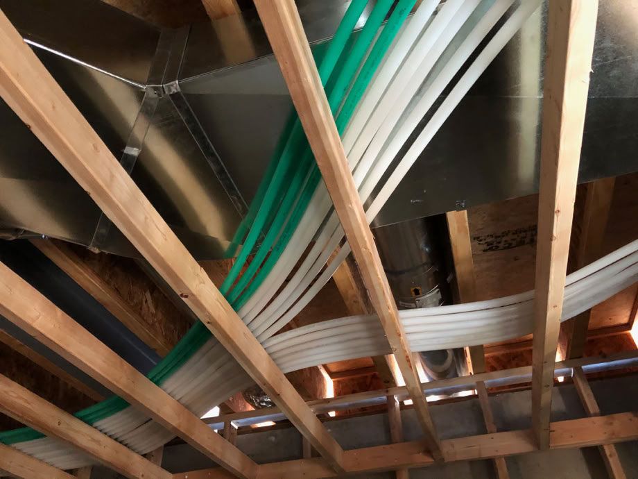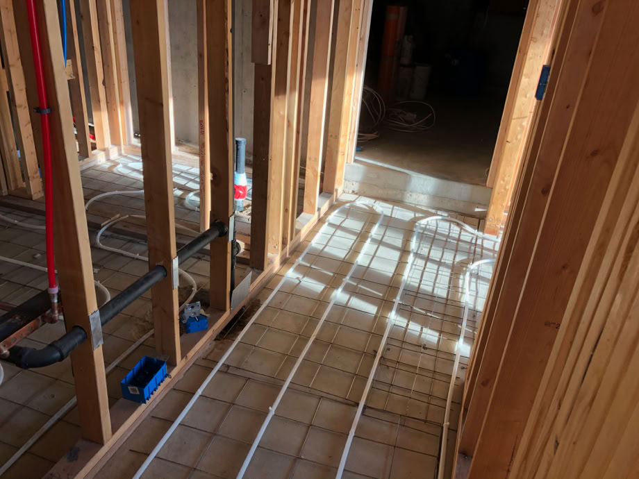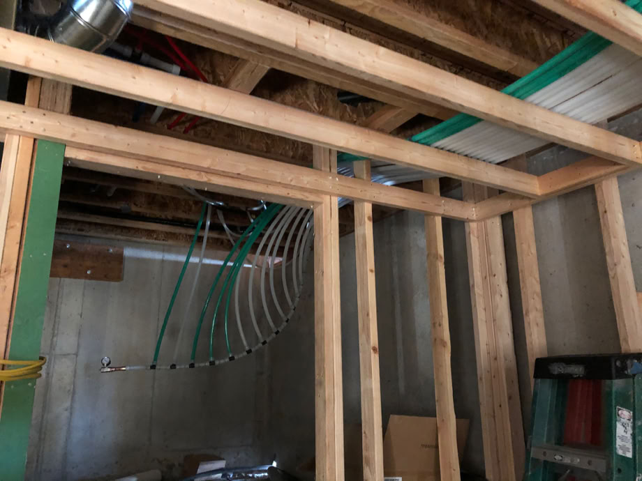 Ceiling of the grotto on the north side and the lower mechanical room. The pipe with the gauge on it is just temporary for the pressure test. Those tubes will go up thru the ceiling of the lower mechanical and connect to the boiler in the upper mechanical room. The two mechanical rooms are above and below each other.