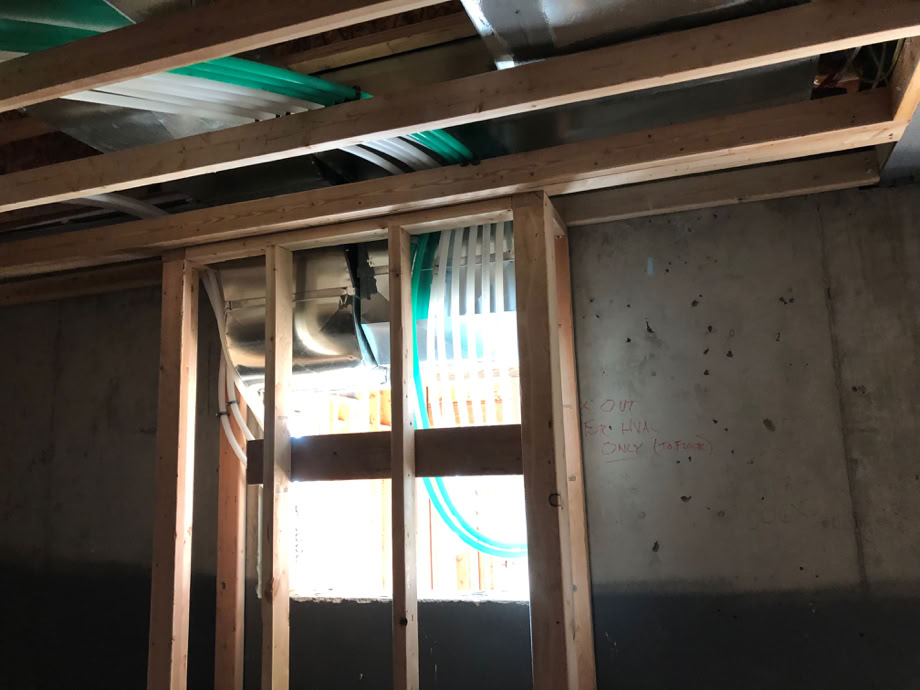 Grotto south wall looking south. That hole in the concrete wall was originally going to be the required crawl space access hatch. Once the Grotto door was cut, the plumber grabbed it to get the in-floor tubes from the lower level to the boiler in the upper level mechanical room.
