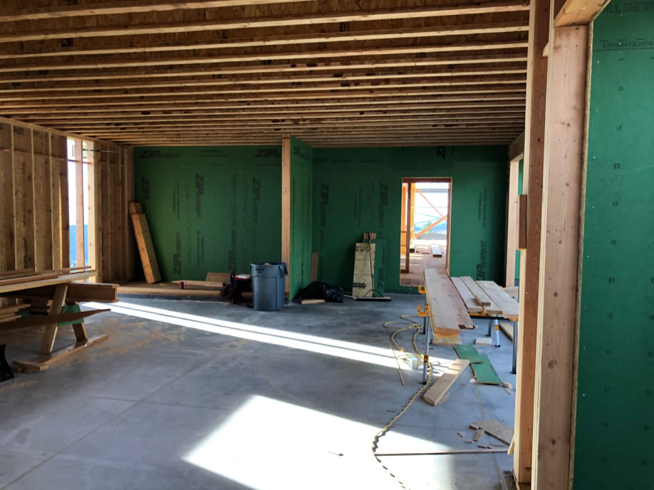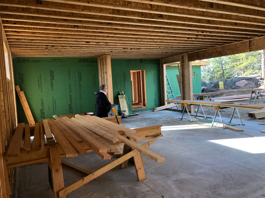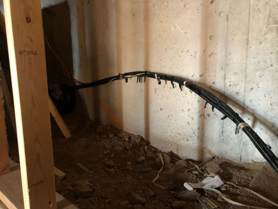 All of the Great Room trusses are up and most of the rest of the roof is sheathed. The electrical mains have been pulled from the pole into the Grotto, which is now power central.