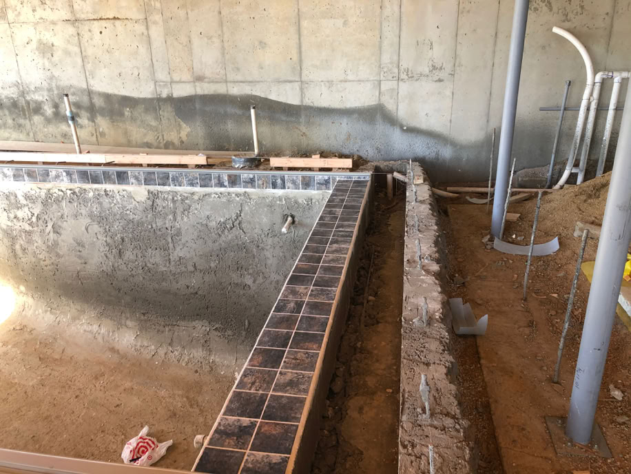 The pool tile is complete. The exterior drains for both the pool perimeter and house perimeter drain had to be re-routed around the septic leach field.