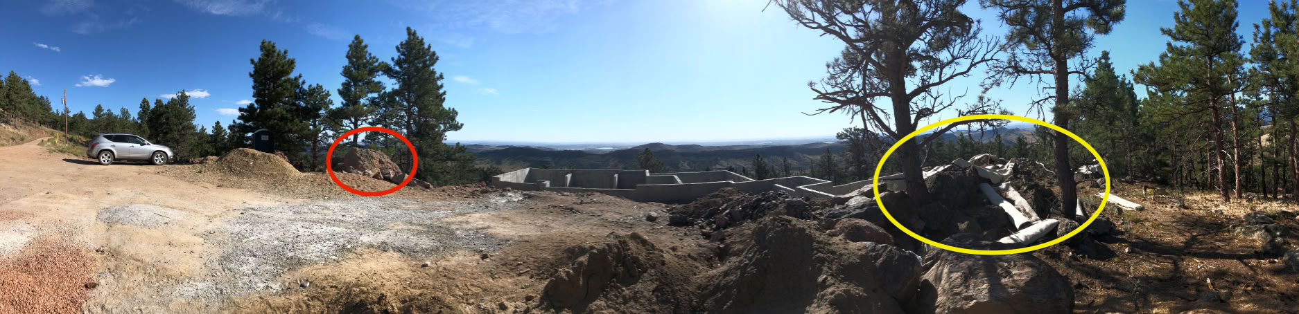 This was shot a bit farther south and east than the original. The rock has a pile of special material at it’s base and many trees have been removed. Believe it or not, the trees circled in yellow are the same ones as the 1st panorama.