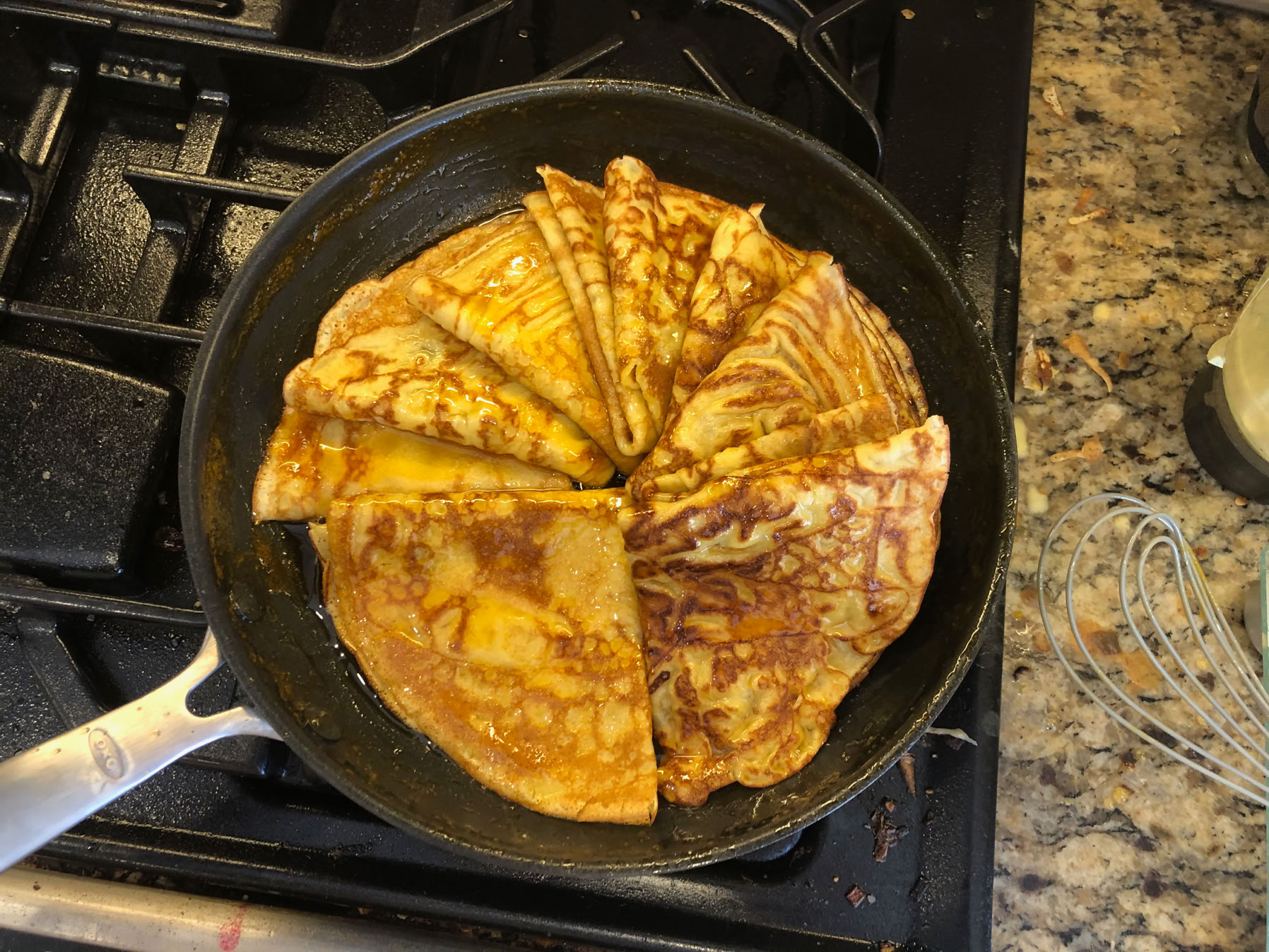 This is what goes to table. All the crêpes have been folded into quarters and placed into the sauce.