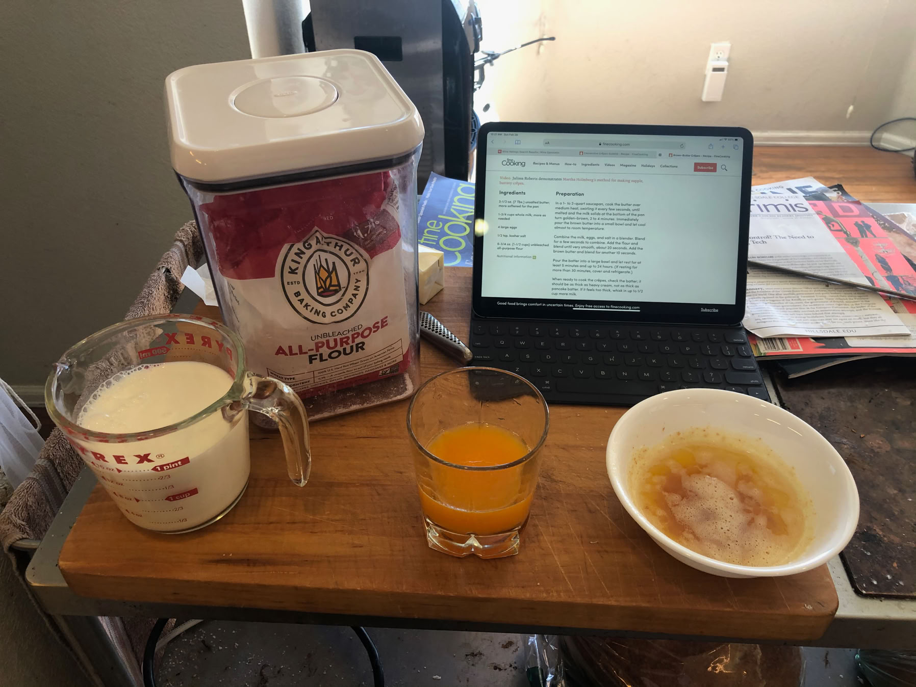 Here’s the mise en place. The cream and egg mix for the crêpes in the measuring cup on the left, the flour and the browned butter on the right for the crêpes. The mandarin juice in the middle and the not shown honey are for the sauce.