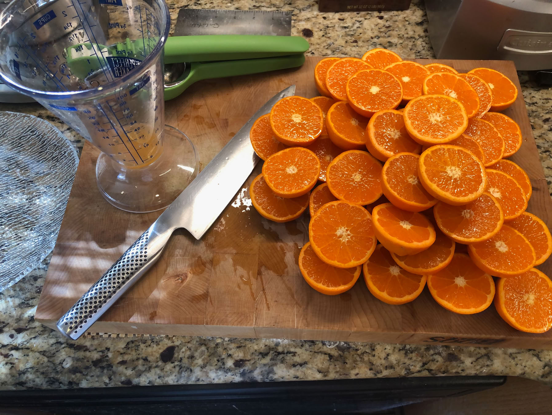 Here are the Mandarins, ready to be juiced. As you can see, these are really good, thin skinned ones. We got a lot of juice, 2 1/2 cups, out of the 3 lbs of them that we got. That’s about a 40% yield, which is really good.