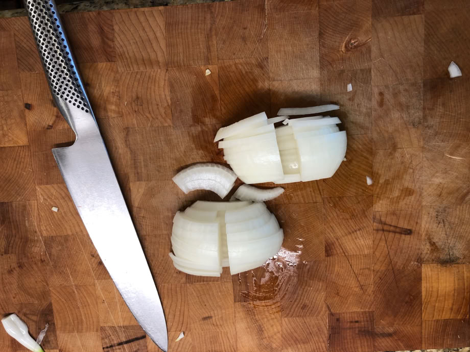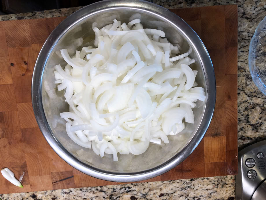 On to the filling! The onions are just sliced, but the outer rings are too big, so the final cut is about half way thru the onion.