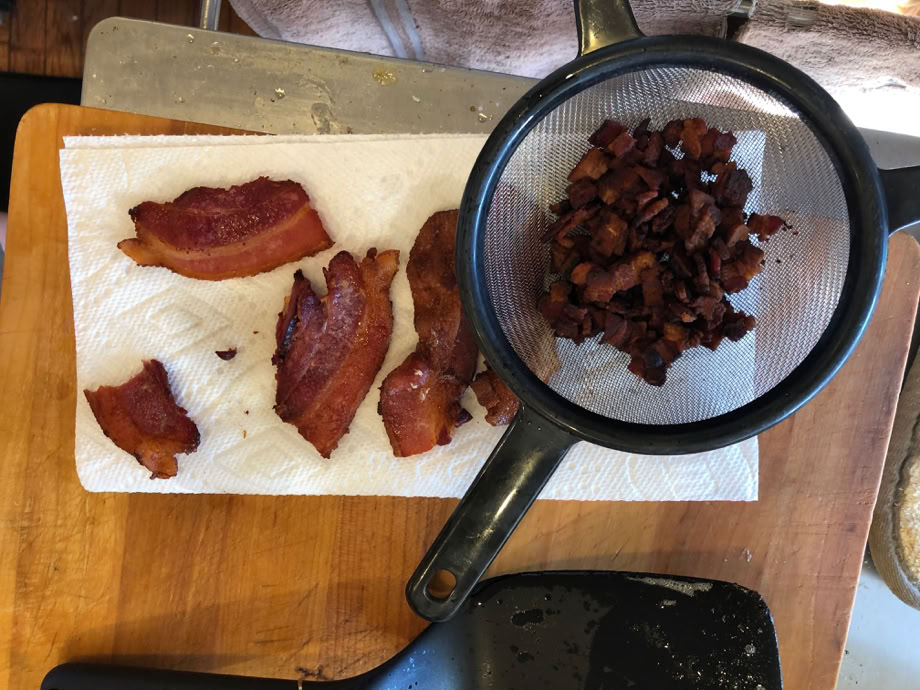 While Martin was prepping the onions, Bill was sizzling up the bacon. We got more than needed, so we could stave off starvation with some snacks!