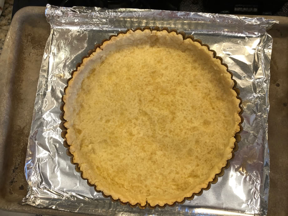 The tart crust is ready for baking. It’s been in the freezer for 30 minutes and is now weighted down for its first bake. While it was freezing, we started on the filling.