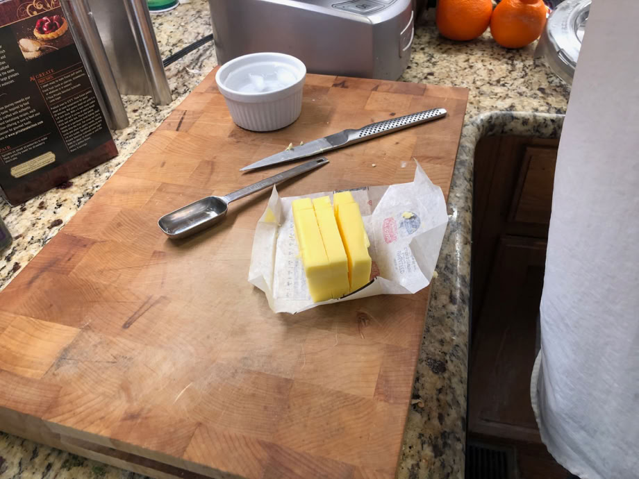 First thing to do is weigh the flour into the food processor bowl, cut the butter into cubes and prep a bit of ice water.