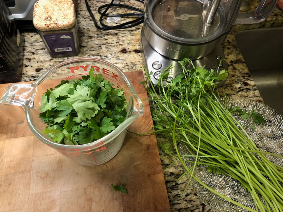 We did, finally, quantify the ratio of parsley leaves to finished product and discovered it’s right about 4 to 1. It takes 4 times the volume of leaves that you need of final product.