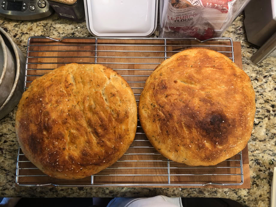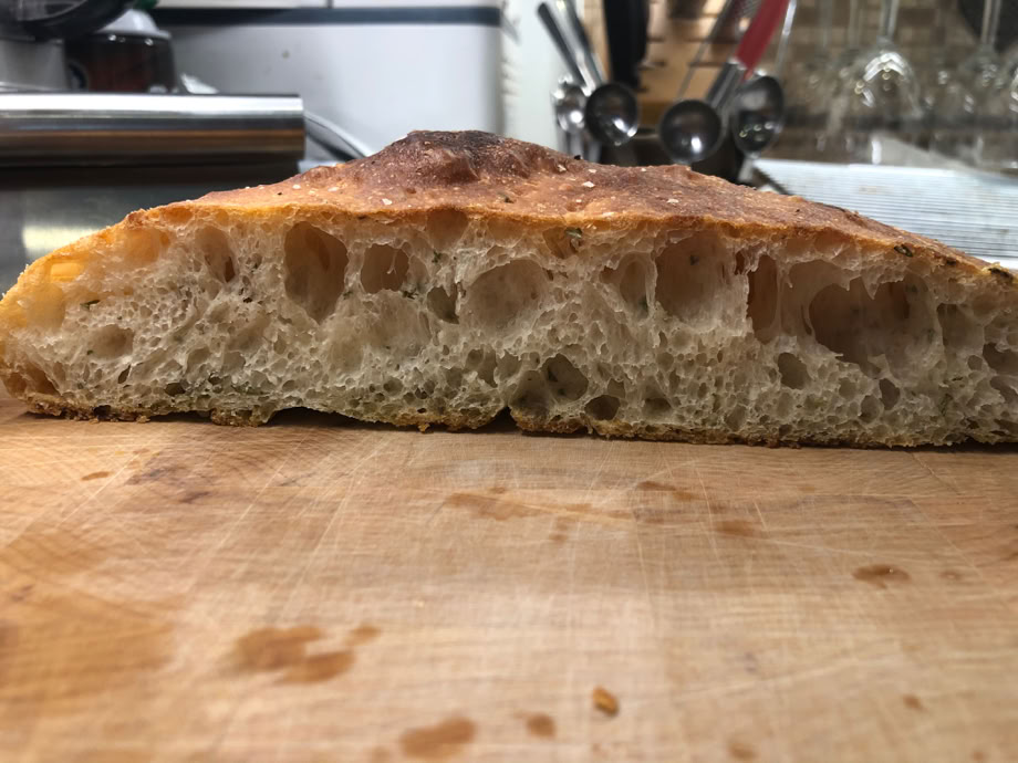 Here’s what the focaccia look like when cut open. This very open “peasant” bread is what happens when you have an extremely hydrated dough. This is about 90% hydrated, which means almost as much water as flour.