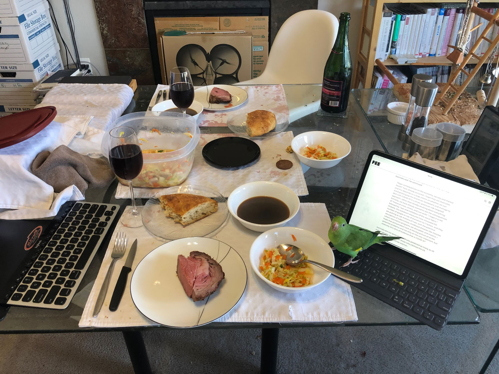 The start of brunch! The prime rib is sliced and we each have a bowl of Au Jus. We’ve also made a very different sweet and sour coleslaw that uses a french style sugar, oil and vinegar. The black plate in the middle is olive oil and balsamic vinegar for dipping the focaccia in. The small chocolate cookie half to the right of the focaccia dip is Livingston’s favorite, he loves just the chocolate cream filling.