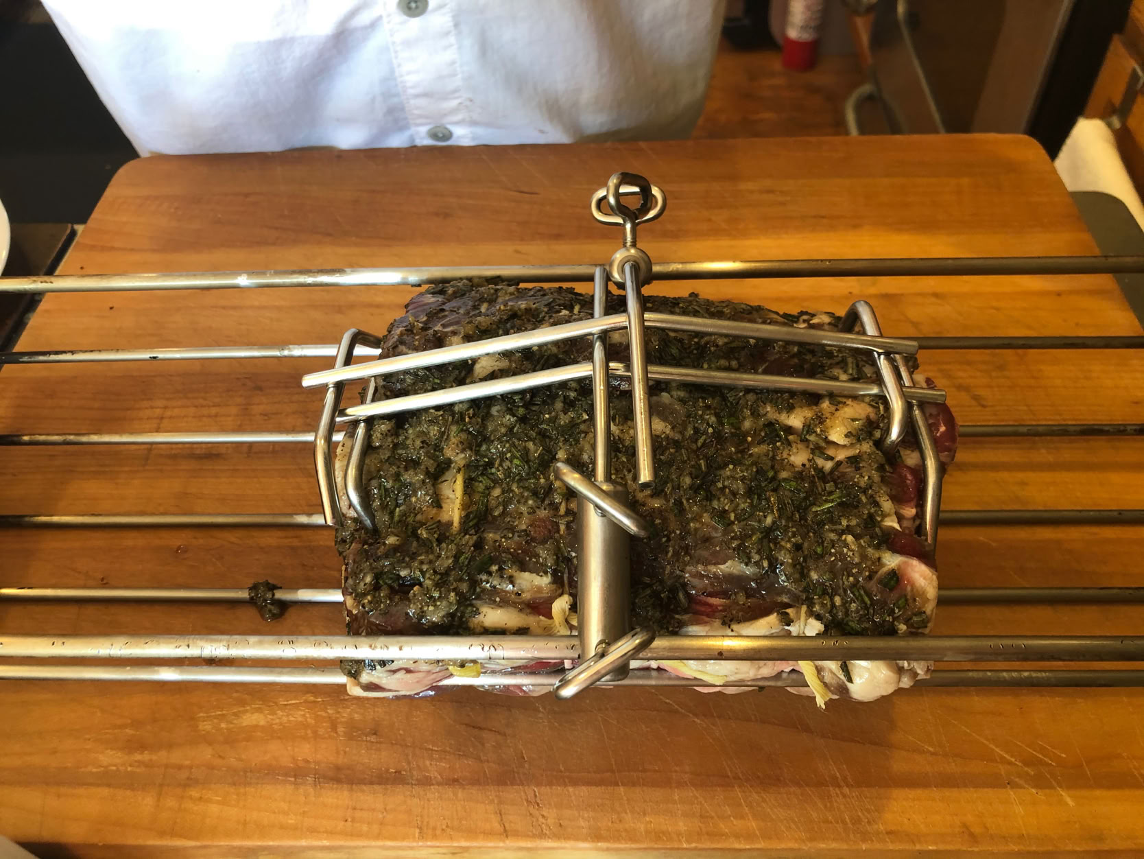 The prime rib roast has been refrigerated over night in the rosemary, garlic salt, pepper and olive oil rub and is now ready. It’s in the Weber’s neat rotisserie basket, which is a lot easier to use than the old forks. You never have a problem with the meat slipping on the forks with this system!