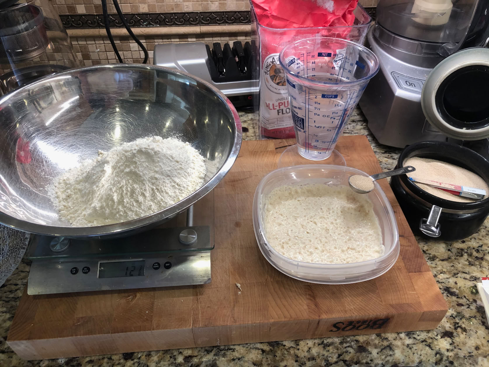 The mise en place for the rosemary focaccia. The all purpose flour is weighed out, the biga (or pre-ferment) is in the small square container, the yeast is in the black ceramic container and the water is measured out in the fancy cup that Katie or Eileen gave us for Christmas long ago.