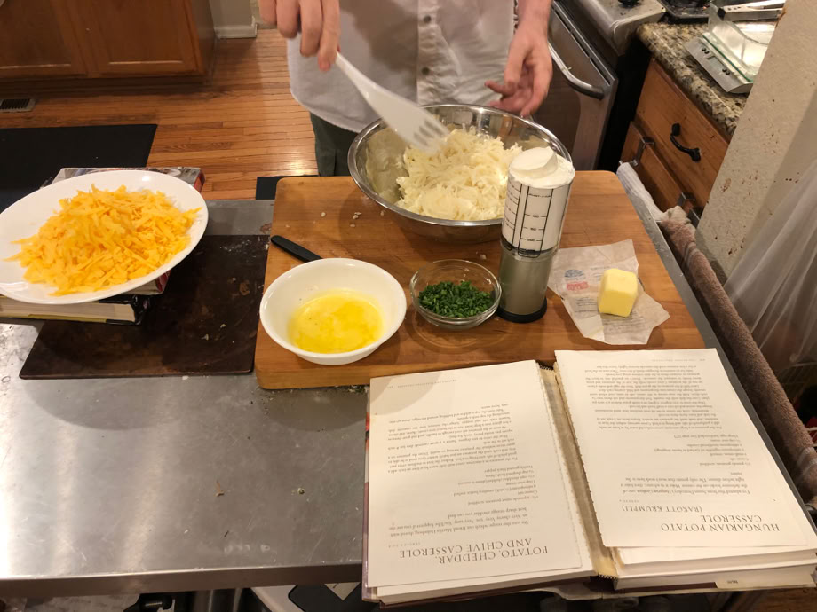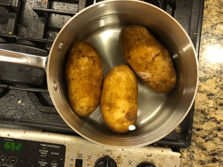 Now, the first part of dinner, the potato casserole. Yes, One Potato, Two Potato does call for boiling them without peeling them!