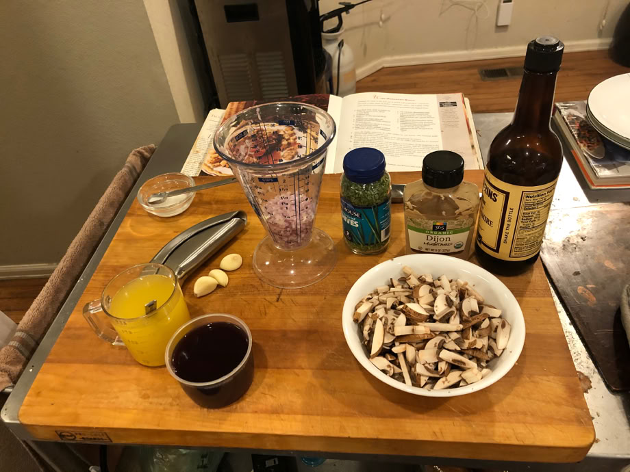 The complete mise en place for the wine merchant steak. In the far row, the cornstarch - water mix (Pepin calls for potato starch, but corn starch works as well), shallots in the fancy measuring cup, freeze dried chives, Dijon mustard and Worcester sauce. Up front, chicken stock, garlic, red wine and a bunch of mushrooms.