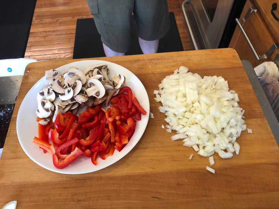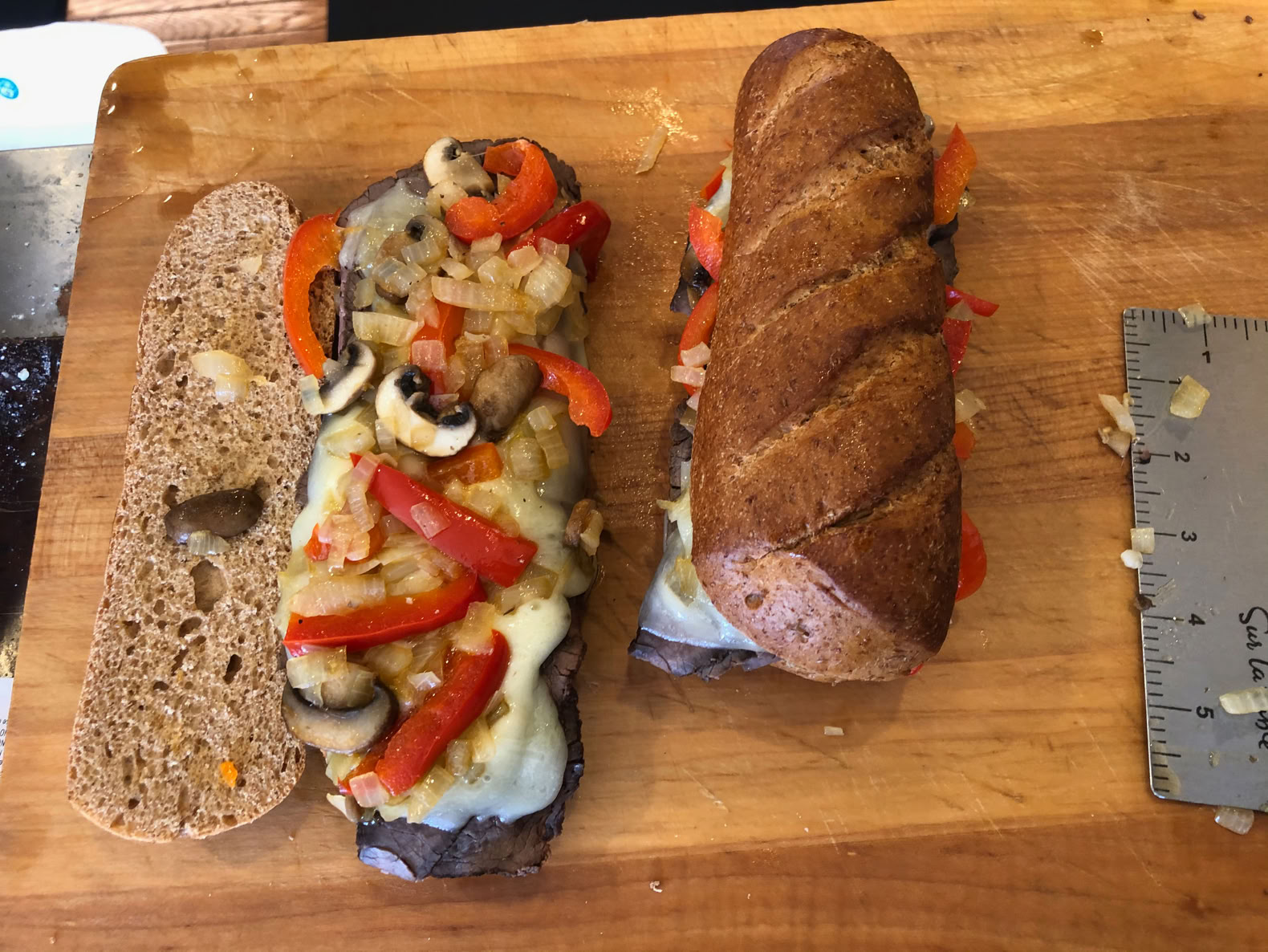 We think that a good cheesesteak needs mushrooms, onions and bell peppers. That turned out to be a bit more bell pepper than needed.