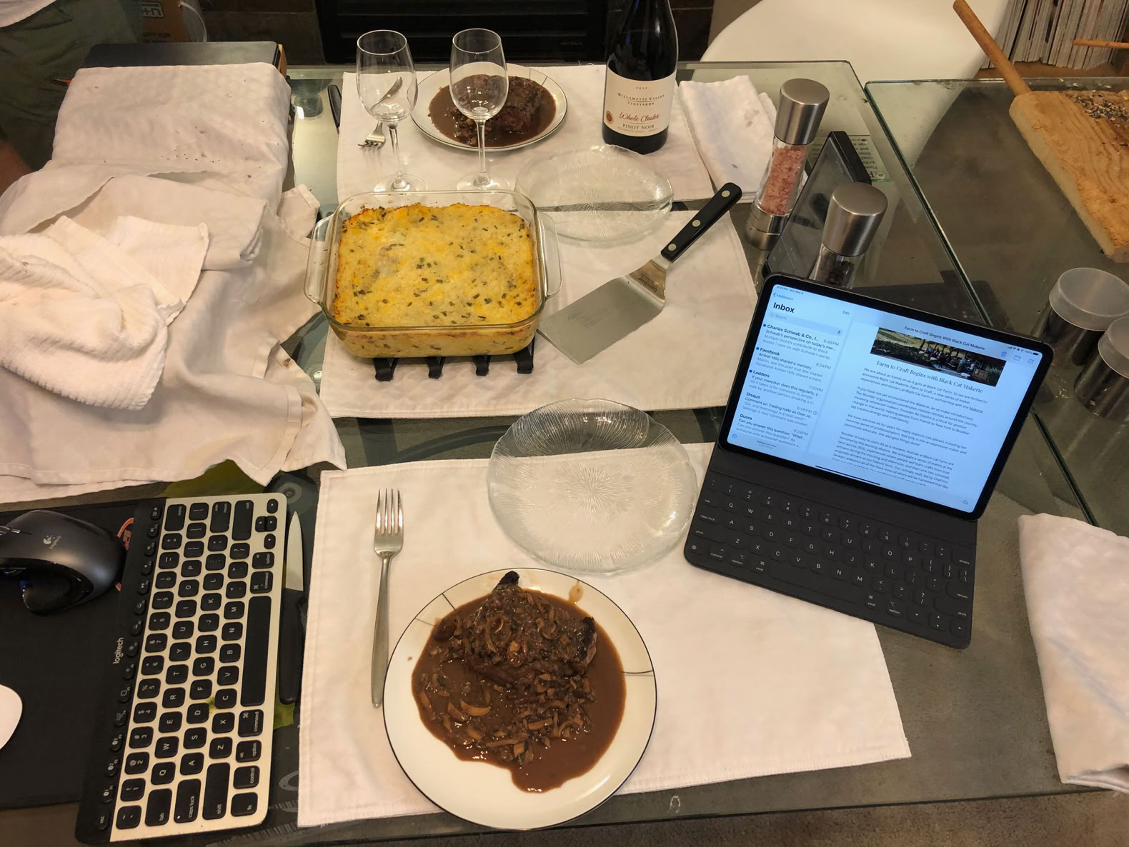 The fully set table. The keyboard is for the Mac Mini that we use to play dinner music and run the Music (formerly iTunes) visualizer.