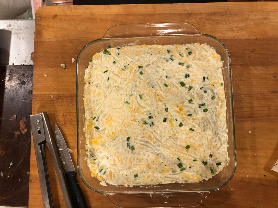 The complete mise en place for the casserole. From left to right - Extra Sharp Cheddar cheese, melted butter, the grated potatoes, chives, sour cream and some extra butter.